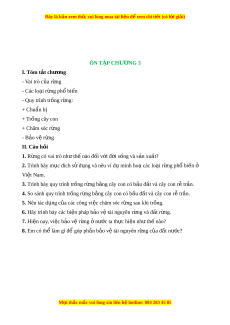 Đây là bản xem th , vu ử i lòng mua tài li u ệ đ xe ể m chi ti t ế (có l i ờ gi i ả ) ÔN TẬP CHƯ N Ơ G 3 I. Tóm t t ắ chư ng ơ - Vai trò c a r ủ ng ừ - Các lo i ạ r ng ph ừ bi ổ n ế - Quy trình tr ng r ồ ng: ừ + Chu n b ẩ ị + Trồng cây con + Chăm sóc r ng ừ - B o ả v r ệ ng ừ II. Câu h i ỏ 1. R ng ừ có vai trò nh t ư h nào đ ế i ố v i ớ đ i ờ s ng và s ố n xu ả t ấ ? 2. Trình bày m c đí ụ ch sử d ng và nêu ví ụ d m ụ inh ho các ạ lo i ạ r ng ph ừ bi ổ n ế ở Việt Nam.