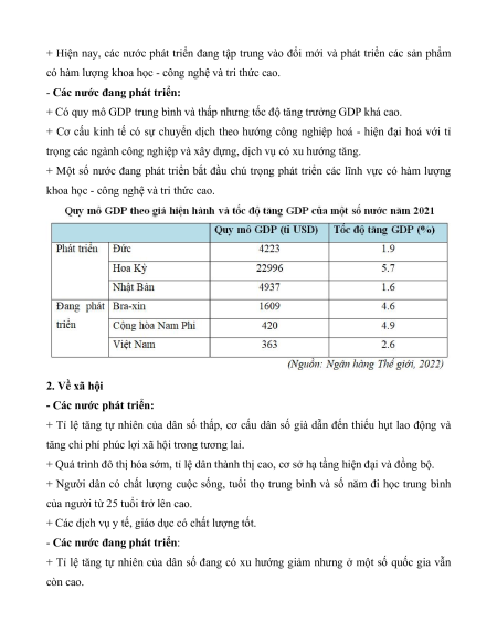 - Theo trình độ phát triển kinh tế - xã hội, các nước trên thế giới phân chia thành nước