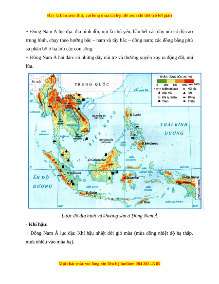 - Địa hình: gồm hai bộ phận: Đông Nam Á lục địa và Đông Nam Á hải đảo.