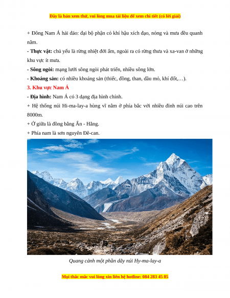 + Đông Nam Á lục địa: địa hình đồi, núi là chủ yếu, hầu hết các dãy núi có độ cao