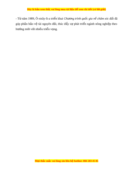 1989, Ô-xtrây-li-a tri n khai ể Chư ng ơ trình qu c gi ố a v ề chăm sóc đ t ấ đã góp ph n ầ b o ả vệ tài nguyên đ t ấ , thúc đ y ẩ sự phát tri n ể ngành nông nghi p ệ theo hư ng ớ m i ớ v i ớ nhi u t ề ri n ể v ng. ọ M i