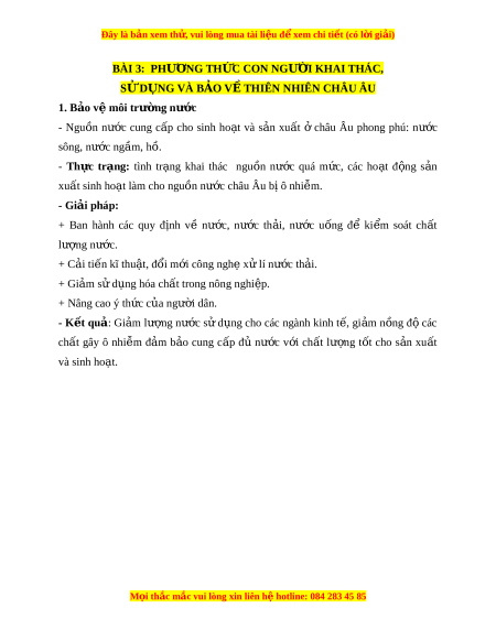 ạ làm cho nguồn nư c châu ớ Âu b ô nhi ị m ễ . - Giải pháp: + Ban hành các quy đ nh ị về nư c, ớ nư c ớ th i ả , nư c ớ u ng ố để ki m ể soát ch t ấ lư ng ợ nư c. ớ + C i ả ti n kĩ ế thu t ậ , đ i ổ m i ớ công ngh x ẹ l ử í nư c ớ th i ả . + Gi m ả s d ử ng hóa ụ ch t ấ trong nông nghi p. ệ + Nâng cao ý th c c ứ a ủ ngư i ờ dân. - K t ế quả: Gi m ả lư ng ợ nư c ớ s ử d ng ụ cho các ngành kinh t , ế gi m ả n ng ồ đ ộ các chất gây ô nhi m ễ đ m ả b o ả cung c p ấ đủ nư c ớ v i ớ ch t ấ lư ng ợ t t ố cho s n ả xu t ấ và sinh ho t ạ . M i
