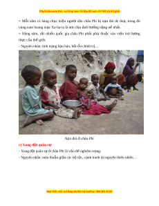 + Mỗi năm có hàng ch c ụ tri u ệ ngư i ờ dân châu Phi bị n n ạ đói đe do , ạ trong đó vùng nam hoang m c X ạ a-ha-ra là n i ơ ch u ị nh h ả ư ng ở n ng n ặ nh ề t ấ . + Hàng năm, r t ấ nhi u ề qu c ố gia châu Phi ph i ả phụ thu c ộ vào vi n ệ trợ lư ng ơ th c ự c a t ủ h gi ế i ớ . - Nguyên nhân: tình tr ng h ạ n ạ hán, b t ấ n chí ổ nh tr … ị N n ạ đói châu P ở hi c) Xung đ t ộ quân sự - Xung đ t ộ quân sự châu Phi ở là v n đ ấ nghi ề êm tr ng. ọ - Nguyên nhân: mâu thu n gi ẫ a các ữ b t ộ c, c ộ nh
