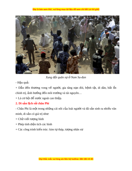 Xung đ t ộ quân s ự N ở am Su-đan - H u qu ậ : ả + D n ẫ đ n ế thư ng ơ vong về ngư i ờ , gia tăng n n ạ đói, b nh ệ t t ậ , di dân, b t ấ n ổ chính trị, nh h ả ư ng ở đ n m ế ôi trư ng và ờ tài nguyên… + Là c h ơ i ộ đ n ể ư c ngoài ớ can thi p. ệ 2. Di sản l ch s ị ử châu Phi - Châu Phi là m t ộ trong nh ng ữ cái nôi c a ủ loài ngư i ờ và đã s n ả sinh ra nhi u ề văn minh, di s n có gi ả á tr nh ị : ư + Chữ vi t ế tư ng hì ợ nh + Phép tính di n t ệ ích các hình + Các công trình ki n ế trúc: kim t t ự háp, tư ng ợ nhân sư