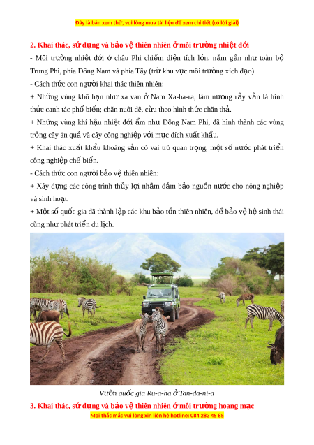 ẩ như Đông Nam Phi, đã hình thành các vùng trồng cây ăn qu và ả cây công nghi p v ệ i ớ m c đí ụ ch xu t ấ kh u. ẩ + Khai thác xu t ấ kh u ẩ khoáng s n ả có vai trò quan tr ng, ọ m t ộ số nư c ớ phát tri n ể công nghiệp chế bi n. ế - Cách th c con ng ứ ư i ờ b o ả v t ệ hiên nhiên: + Xây d ng ự các công trình th y ủ l i ợ nh m ằ đ m ả b o ả ngu n ồ nư c ớ cho nông nghi p ệ và sinh ho t ạ . + M t ộ số qu c ố gia đã thành l p ậ các khu b o ả t n ồ thiên nhiên, đ b ể o ả v ệ h ệ sinh thái cũng như phát tri n du l ể ịch. Vư n qu ờ ốc gia Ru-a-ha T ở an-da-ni-a 3. Khai thác, s d ử ng và b ụ o v ả t ệ hiên nhiên m ở ôi trư ng hoang m ờ c ạ