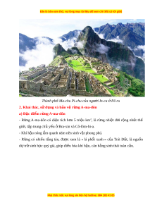 Thành phố Ma-chu Pi-chu c a ng ủ ư i ờ In-ca P ở ê-ru 2. Khai thác, s d ử ng và b ụ o v ả r ệ ng ừ A-ma-dôn a) Đặc đi m ể r ng ừ A-ma-dôn - R ng ừ A-ma-dôn có di n ệ tích h n ơ 5 tri u ệ km2, là r ng ừ nhi t ệ đ i ớ r ng ộ nh t ấ thế gi i ớ , t p ậ trung chủ y u ế B ở ra-xin và Cô-lôm-bi-a. - Khí h u nóng ậ m ẩ quanh năm nên sinh v t ậ phong phú. - R ng ừ có nhi u ề t ng ầ tán, đư c ợ xem là « lá ph i ổ xanh » c a ủ Trái Đ t ấ , là ngu n ồ d t ự r s ữ inh h c quý gi ọ á, giúp đi u hòa khí ề h u, ậ cân b ng s ằ inh thái toàn c u. ầ