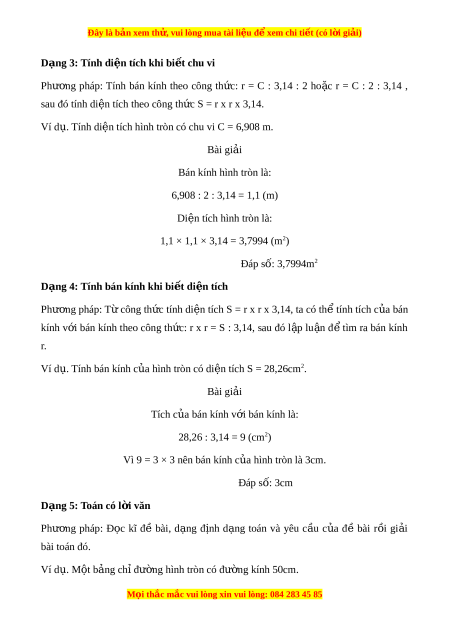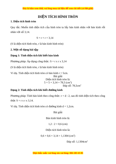 Đây là bản xem th , vu ử i lòng mua tài li u ệ đ xe ể m chi ti t ế (có l i ờ gi i ả ) DI N Ệ TÍCH HÌNH TRÒN 1. Di n t ệ ích hình tròn Quy t c: ắ Muốn tính di n ệ tích c a ủ hình tròn ta l y ấ bán kính nhân v i ớ bán kính r i ồ nhân v i ớ số 3,14. S = r × r × 3,14 (S là di n t