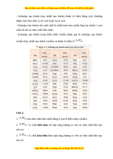 Đây là bản xem th , vu ử i lòng mua tài li u ệ đ xe ể m chi ti t ế (có l i ờ gi i ả ) - Enthalpy t o ạ thành (hay nhi t ệ t o ạ thành) đư c ợ kí hi u ệ b ng ằ ∆fH, thư ng ờ đư c t ợ ính theo đ n ơ v kJ ị / mol ho c kcal ặ / mol. - Enthalpy t o ạ thành c a ủ m t ộ ch t ấ là nhi t ệ kèm theo ph n ả ng ứ t o ạ thành 1 mol chất đó t các đ ừ n ch ơ ất b n nh ề ất. - Enthalpy t o ạ thành trong đi u ề ki n ệ chu n ẩ đư c ợ g i ọ là enthalpy t o ạ thành o chuẩn (hay nhiệt t o ạ thành chu n ẩ ) và đư c ợ kí hi u l ệ à H f 298 . Chú ý: o 1. H f 298 c a ủ đ n ch ơ ất b n nh ề t ấ b ng 0 ( ằ xét đi ở u ki ề n chu ệ n ẩ ). o 2. H f 298 < 0, ch t ấ b n ề h n ơ về m t ặ năng lư ng ợ so v i ớ các đ n ơ ch t ấ b n ề t o ạ nên nó. o 3. H f 298 > 0, ch t ấ kém b n ề h n ơ m t ặ năng lư ng ợ so v i ớ các đ n ơ ch t ấ b n ề t o ạ nên nó. M i