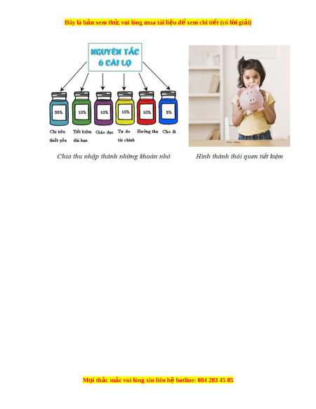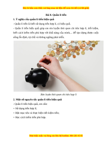 Đây là bản xem th , vu ử i lòng mua tài li u ệ đ xe ể m chi ti t (c ế ó l i ờ gi i ả ) Bài 8. Qu n l ả í ti n ề 1. Ý nghĩa c a qu ủ n l ả í ti n hi ề u qu ệ ả - Qu n l ả í ti n ề là bi t ế s d ử ng t ụ i n h ề p l ợ í, có hi u qu ệ . ả - Qu n ả lí ti n ề hi u ệ quả giúp em rèn luy n ệ thói quen chi tiêu h p ợ lí, ti t ế ki m ệ , bi t ế cách ki m ế ti n ề phù h p ợ v i ớ khả năng c a ủ mình,... để t o ạ d ng ự đư c ợ cu c ộ sống ổn định, t ch ự và không ng ủ ng ừ phát tri n. ể 2. M t ộ s nguyên t ố c q ắ u n l ả í ti n hi ề u q ệ uả - Qu n l ả í ti n hi ề u qu ệ , em ả c n: ầ + S d ử ng t ụ i n h ề p ợ lí; + Đ t ặ m c t ụ iêu và th c hi ự n t ệ i t ế ki m ệ ti n; ề + H c ọ cách ki m ế ti n phù h ề p. ợ M i