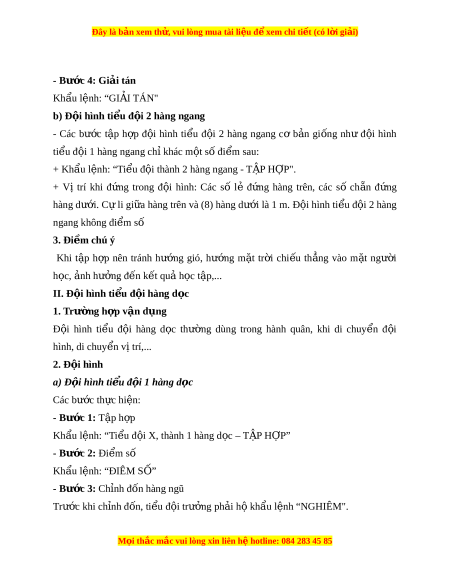 Đây là bản xem th , vu ử i lòng mua tài li u ệ đ xe ể m chi ti t (c ế ó l i ờ gi i ả ) - Bư c ớ 4: Gi i ả tán Khẩu l nh: ệ “GI I Ả TÁN" b) Đ i ộ hình ti u đ ể i ộ 2 hàng ngang - Các bư c ớ t p ậ h p ợ đ i ộ hình ti u ể đ i ộ 2 hàng ngang cơ b n ả gi ng ố như đ i ộ hình ti u đ ể i ộ 1 hàng ngang ch khác m ỉ t ộ số đi m ể sau: + Khẩu l nh: ệ “Ti u ể đ i ộ thành 2 hàng ngang - T P Ậ H P" Ợ . + Vị trí khi đ ng ứ trong đ i
