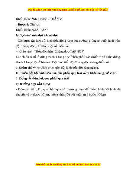 Đây là bản xem th , vu ử i lòng mua tài li u ệ đ xe ể m chi ti t (c ế ó l i ờ gi i ả ) b) Khẩu l n ệ h - Đ ng t ộ ác ti n, l ế ùi: + Kh u l ẩ nh: ệ “Ti n ế X bư c - ớ B C ƯỚ " ho c “L ặ ùi X bư c- ớ B C ƯỚ " + Kh u l ẩ nh: ệ “Qua ph i ả 3 bư c – B ớ C ƯỚ ” ho c ặ qua trái X bư c ớ – B C ƯỚ ” c) Đ ng t ộ ác - Nghe d t ứ đ ng ộ l nh ệ “B C ƯỚ " toàn ti u ể đ i ộ đ ng ồ lo t ạ ti n ế (lùi) ho c ặ qua ph i ả (trái) nh ph ư n t ầ ng ng ừ ư i ờ . - Khi bư c đ ớ ủ số bư c quy đ ớ nh t ị hì đ ng l ứ i ạ tự đ ng gi ộ óng hàng đúng c l ự i, gián cách rồi trở v t ề t ư h đ ế ng nghi ứ êm. d) Đi m ể chú ý M i