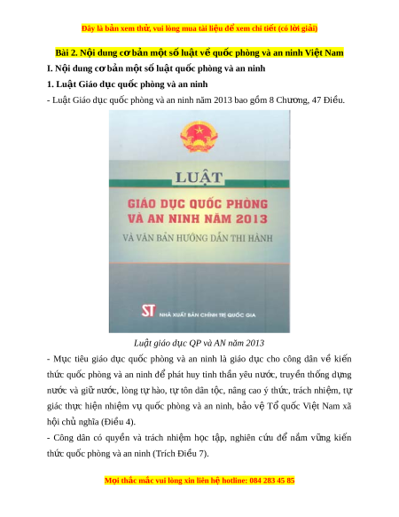 Đây là bản xem th , vu ử i lòng mua tài li u ệ đ xe ể m chi ti t (c ế ó l i ờ gi i ả ) Bài 2. N i ộ dung c b ơ n m ả t ộ s l ố u t ậ v qu ề c phòng và an ni ố nh Vi t ệ Nam I. N i ộ dung c b ơ n m ả t ộ s l ố u t ậ qu c ố phòng và an ninh 1. Luật Giáo d c qu ụ c ố phòng và an ninh - Lu t ậ Giáo d c qu ụ