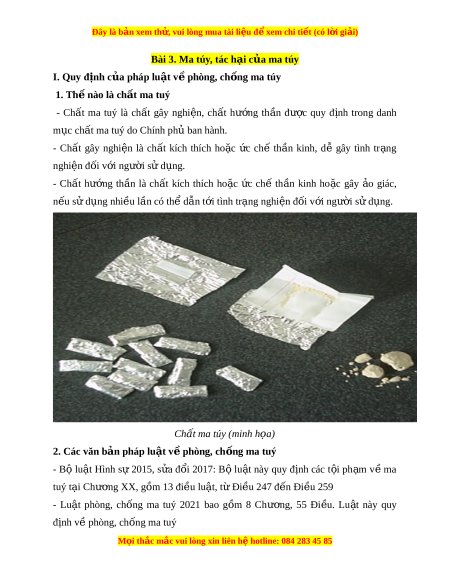 Chất ma túy (minh h a) ọ 2. Các văn b n p ả háp lu t ậ v phòng, ch ề ng m ố a tuý - Bộ lu t ậ Hình s ự 2015, s a ử đ i ổ 2017: B ộ lu t ậ này quy đ nh ị các t i ộ ph m ạ v ề ma tuý t i ạ Chư ng X ơ X, g m ồ 13 đi u l ề u t ậ , t Đ ừ i u 247 đ ề n Đ ế i u 259 ề - Lu t ậ phòng, ch ng ố ma tuý 2021 bao g m ồ 8 Chư ng, ơ 55 Đi u. ề Lu t ậ này quy định v phòng, ch ề ống ma tuý M i