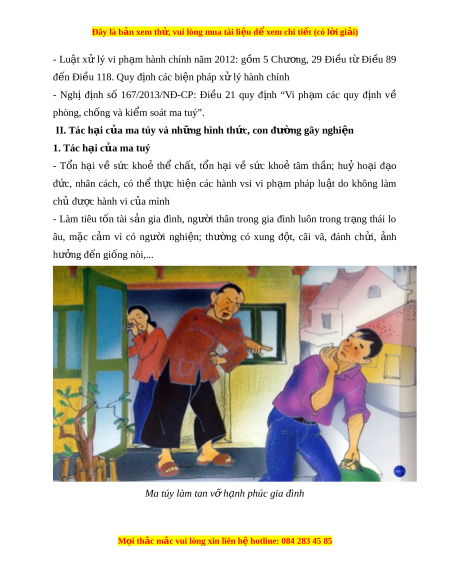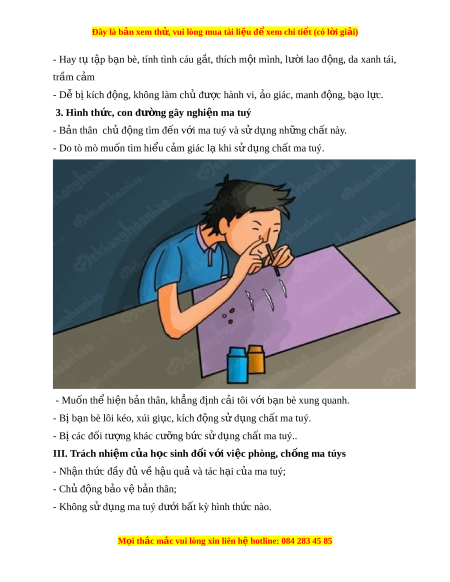 Đây là bản xem th , vu ử i lòng mua tài li u ệ đ xe ể m chi ti t (c ế ó l i ờ gi i ả ) - Hay tụ t p ậ b n ạ bè, tính tình cáu g t ắ , thích m t ộ mình, lư i ờ lao đ ng, ộ da xanh tái, tr m ầ c m ả - D b ễ ị kích đ ng, không l ộ àm chủ đư c hành vi ợ , o ả giác, manh đ ng, b ộ o ạ l c. ự 3. Hình th c, con đ ứ ư ng gây nghi ờ n m ệ a tuý - B n ả thân ch đ ủ ng t ộ ìm đ n v ế i ớ ma tuý và s d ử ng ụ nh ng ch ữ t ấ này. - Do tò mò mu n t ố ìm hi u c ể m ả giác l khi ạ s d ử ng ch ụ t ấ ma tuý. - Muốn th hi ể n b ệ n t ả hân, kh ng ẳ đ nh c ị i ả tôi v i ớ b n ạ bè xung quanh. - Bị b n
