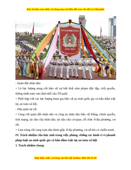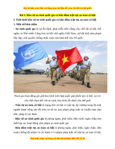 Đây là bản xem th , vu ử i lòng mua tài li u ệ đ xe ể m chi ti t (c ế ó l i ờ gi i ả ) Bài 5. Bảo v an n ệ inh qu c gi ố a và b o đ ả m ả tr t ậ t , an t ự oàn xã h i ộ I. Tình hình b o v ả an ni ệ nh qu c ố gia và b o đ ả m ả tr t ậ t , an t ự oàn xã h i ộ 1. M t ộ s khái ố ni m ệ - An ninh qu c ố gia là sự n ổ đ nh, ị phát tri n ể b n ề v ng ữ c a ủ chế độ xã h i ộ chủ nghĩa và Nhà nư c ớ C ng ộ hoà xã h i ộ ch ủ nghĩa Vi t ệ Nam, s ự b t ấ kh ả xâm ph m ạ đ c ộ l p, ch ậ quy ủ n, ề th ng nh ố t ấ , toàn v n l ẹ ãnh th c ổ a ủ T qu ổ c. ố Tham gia ho t ạ đ ng gì ộ n gi hòa bì ữ nh Liên h p qu ợ c góp ph ố n t â o ạ v t ị h , vai ê trò c a