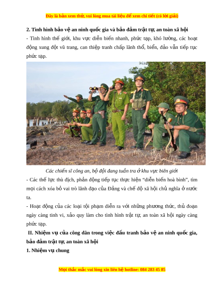 Đây là bản xem th , vu ử i lòng mua tài li u ệ đ xe ể m chi ti t (c ế ó l i ờ gi i ả ) 2. Tình hình b o v ả an n ệ inh qu c gi ố a và b o đ ả m ả tr t ậ t , an t ự oàn xã h i ộ - Tình hình thế gi i ớ , khu v c ự di n ễ bi n ế nhanh, ph c ứ t p, ạ khó lư ng, ờ các ho t ạ đ ng ộ xung đ t ộ vũ trang, can thi p ệ tranh ch p ấ lãnh th , ổ bi n, ể đ o ả v n ẫ ti p ế t c ụ ph c ứ t p. ạ Các chi n s ê ĩ công an, b đ ộ i ộ đang tu n t â ra khu ở v c bi ự ên gi i ớ - Các thế l c ự thù đ ch, ị ph n ả đ ng ộ ti p ế t c ụ th c ự hi n ệ “di n ễ bi n ế hoà bình”, tìm m i