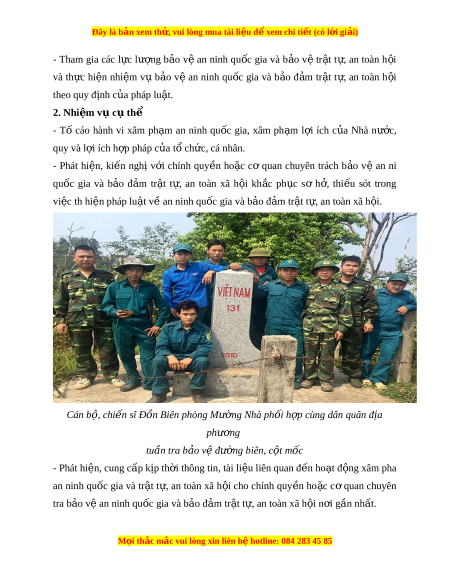 ố h p cùng dân quân đ ợ a ị phư ng ơ tuân tra b o v ả đ ê ư ng ờ biên, c t ộ m c ố - Phát hi n, cung c ệ p k ấ p t ị h i ờ thông tin, tài li u l ệ iên quan đ n ho ế t ạ đ ng xâm ộ pha an ninh qu c ố gia và tr t ậ t , ự an toàn xã h i ộ cho chính quy n ề ho c ặ c ơ quan chuyên tra b o v ả an ni ệ nh quốc gia và b o ả đ m ả tr t ậ t , an ự toàn xã h i ộ n i ơ g n nh ầ t ấ . M i
