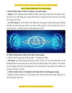 ờ trong đó thông tin đư c ợ cung c p, ấ truy n ề đ a, ư thu th p, ậ x ử lý, l u ư trữ và trao đ i ổ thông qua m ng ạ vi n ễ thông và m ng ạ máy tính (Lu t ậ An toàn thông tin m ng ạ năm 2015). - An ninh m ng ạ là sự b o ả đ m ả ho t ạ đ ng ộ trên không gian m ng ạ không gây phư ng ơ h i ạ đ n ế an ninh qu c ố gia, tr t ậ t , ự an toàn xã h i ộ , quy n ề và l i ợ ích h p ợ pháp c a ủ Cơ quan, tổ ch c, ứ cá nhân (Lu t ậ An ninh m ng năm ạ 2018). II. M t ộ s n ố i ộ dung c b ơ n c ả a L ủ u t ậ an ninh m ng ạ - Lu t ậ An ninh m ng năm ạ 2018 bao g m ồ : 7 Chư ng, ơ 43 đi u. ề - N i ộ dung: quy đ nh ị nh ng ữ n i ộ dung cơ b n ả về b o ả vệ an ninh m ng ạ đ i ố v i ớ hệ thống thông tin quan tr ng ọ về an ninh qu c ố gia phòng ng a, ừ x ử lý hành vi xâm ph m ạ an ninh m ng, ạ tri n khai ể ho t ạ đ ng ộ b o ả v ệ an ninh m ng ạ và quy đ nh t ị rách nhi m ệ c a ủ cơ quan, tổ ch c, ứ cá nhân. 1. M t ộ s nhóm ố hành vi b nghi ị êm c m ấ th c hi ự n t