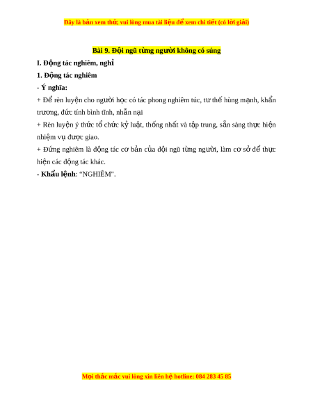 Đây là bản xem th , vu ử i lòng mua tài li u ệ đ xe ể m chi ti t (c ế ó l i ờ gi i ả ) Bài 9. Đ i ộ ngũ t ng ng ừ ư i ờ không có súng I. Đ ng t ộ ác nghiêm, nghỉ 1. Đ ng ộ tác nghiêm - Ý nghĩa: + Để rèn luy n ệ cho ngư i ờ h c