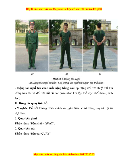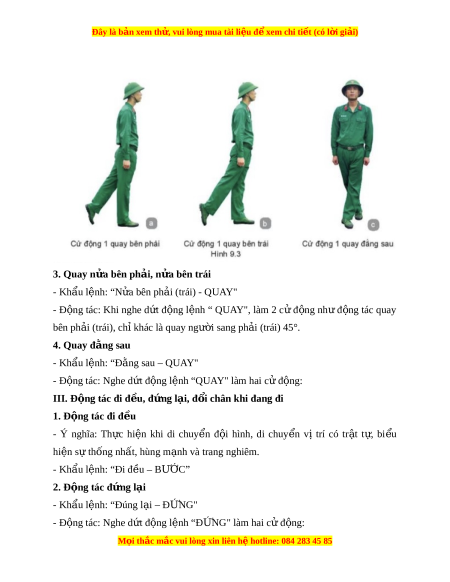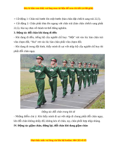 Đây là bản xem th , vu ử i lòng mua tài li u ệ đ xe ể m chi ti t (c ế ó l i ờ gi i ả ) 3. Quay n a bê ử n ph i ả , n a bên t ử rái - Khẩu l nh: ệ “N a ử bên ph i ả (trái) - QUAY" - Đ ng ộ tác: Khi nghe d t ứ đ ng ộ l nh ệ “ QUAY", làm 2 c ử đ ng ộ nh ư đ ng ộ tác quay bên ph i ả (trái), ch khác l ỉ à quay ngư i ờ sang ph i ả (trái) 45°. 4. Quay đ ng s ằ au - Khẩu l nh: ệ “Đ ng s ằ au – QUAY" - Đ ng t ộ ác: Nghe d t ứ đ ng l ộ nh “Q ệ UAY" làm hai c đ ử ng: ộ III. Đ ng t ộ ác đi đ u, đ ề ng l ứ i ạ , đ i ổ chân khi đang đi 1. Đ ng ộ tác đi đ u ề - Ý nghĩa: Th c ự hi n ệ khi di chuy n ể đ i ộ hình, di chuy n ể vị trí có tr t ậ t , ự bi u ể