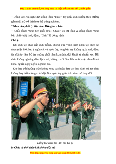 ư ý ngón cái và ngón út), lòng bàn tay không ng a ừ quá, đ ng ộ tác đ a ư tay lên, bỏ tay xu ng ố ph i ả nhanh, m nh, ạ d t ứ khoát và chu n ẩ xác. Khi chào không nghiêng đ u, ầ l ch ệ vai, không cư i ờ đùa, li c ế m t ắ ho c ặ nhìn đi n i ơ khác, ngư i ờ ngay ng n, ắ nghiêm túc. - Khi thay đ i ổ hư ng ớ chào không xoay vai ho c ặ đ a
