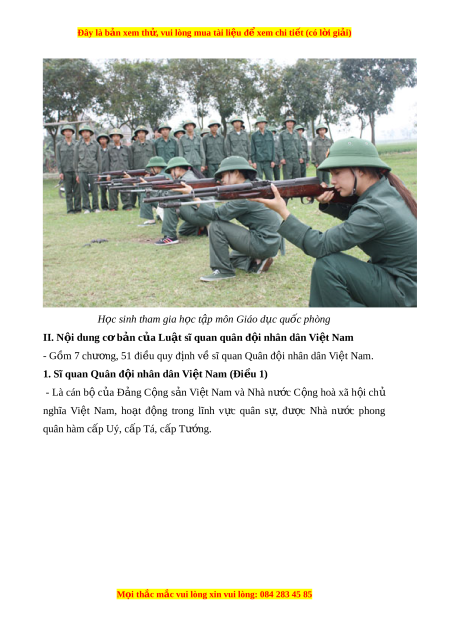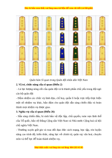 Đây là bản xem th , vu ử i lòng mua tài li u ệ đ xe ể m chi ti t (c ế ó l i ờ gi i ả ) H c s ọ inh tham gia h c t ọ p m ậ ôn Giáo d c qu ụ c phòng ố II. N i ộ dung cơ b n c ả a L ủ u t ậ sĩ quan quân đ i ộ nhân dân Vi t ệ Nam - Gồm 7 chư ng, 51 đi ơ u quy đ ề nh v ị s ề ĩ quan Quân đ i ộ nhân dân Vi t ệ Nam. 1. Sĩ quan Quân đ i ộ nhân dân Vi t ệ Nam (Đi u 1 ề ) - Là cán b ộ c a ủ Đ ng ả C ng ộ s n ả Vi t ệ Nam và Nhà nư c ớ C ng ộ hoà xã h i ộ chủ nghĩa Vi t ệ Nam, ho t ạ đ ng ộ trong lĩnh v c ự quân s , ự đư c ợ Nhà nư c ớ phong quân hàm cấp Uý, c p ấ Tá, c p ấ Tư ng. ớ M i ọ thắc m c