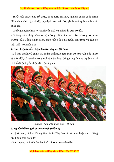 ụ tùng chỉ huy, nghiêm ch nh ỉ ch p ấ hành đi u ề l n ệ h, đi u ề l , ệ ch ế đ , ộ quy đ nh ị c a ủ quân đ i ộ , gi ữ bí m t ậ quân s , ự bí m t ậ quốc gia. - Thư ng xuyên chăm ờ lo l i ợ ích v t ậ ch t ấ và tinh th n c ầ a b ủ đ ộ i ộ . - Gư ng ơ m u ẫ ch p ấ hành và v n ậ đ ng ộ nhân dân th c ự hi n ệ đư ng ờ l i ố , chủ trư ng ơ c a ủ Đ ng, ả chính sách, pháp lu t ậ c a ủ Nhà nư c, ớ tôn tr ng ọ và g n ắ bó m t ậ thi t ế v i ớ nhân dân 4. Đi u ki ề n t ệ uy n ch ể n đào t ọ o s ạ ĩ quan (Đi u 4) ề - Đủ tiêu chu n ẩ về chính tr ,ị ph m ẩ ch t ấ đ o ạ đ c, ứ trình đ ộ h c ọ v n, ấ s c ứ khoẻ và tu i ổ đ i ờ ; có nguy n ệ v ng ọ và kh ả năng ho t ạ đ ng ộ trong lĩnh v c ự quân s ự thì có thể đư c t ợ uy n ch ể n ọ đào t o s ạ ĩ quan. Sĩ quan Quân đ i ộ nhân dân Vi t ệ Nam 5. Ngu n b ồ ổ sung sĩ quan t i ạ ngũ (Đi u 5) ề - Hạ sĩ quan, binh sĩ t t ố nghi p ệ các trư ng ờ đào t o ạ sĩ quan ho c ặ các trư ng ờ đ i ạ h c ngoài ọ quân đ i ộ - H s