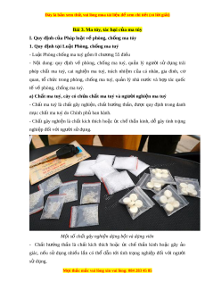 Bài 3. Ma túy, tác hại c a m ủ a túy I. Quy đ nh c ị a P ủ háp lu t ậ v phò ề ng, ch ng ố ma túy 1. Quy đ nh t ị i ạ Lu t ậ Phòng, ch ng m ố a tuý - Lu t ậ Phòng chống ma tuý g m ồ 8 chư ng 55 đi ơ u ề - N i ộ dung: quy đ nh ị về phòng, ch ng ố ma tuý, qu n ả lý ngư i ờ sử d ng ụ trái phép ch t ấ ma tuý, cai nghi n ệ ma tuý, trách nhi m ệ c a ủ cá nhân, gia đình, cơ quan, tổ ch c ứ trong phòng, ch ng ố ma tuý, qu n ả lý nhà nư c ớ và h p ợ tác qu c ố t v ế phòng, ch ề ống ma tuý.