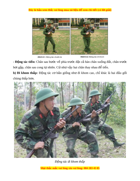 II. Đi khom cao, đi khom th p, ch ấ y khom ạ 1. Trư ng h ờ p v ợ ận d ng ụ - Đi khom cao v n ậ d ng khi ụ ta còn cách tư ng ơ đ i ổ xa đ ch, đ ị a hì ị nh có v t ậ che khu t ấ , che đ cao ngang t ỡ ầm ng c ho ự c ặ đêm tối, tr i ờ m a, s ư ư ng m ơ ù, đ ch khó phát ị hi n. ệ - Đi khom th p ấ v n ậ d ng ụ khi ta ở tư ng ơ đ i ố g n ầ đ ch, ị n i ơ đ a ị hình có v t ậ che đ , ỡ che khuất cao ngang tầm ng c. ự - Ch y ạ khom v n ậ d ng ụ khi vư t ợ qua đ a ị hình tr ng ố tr i ả trong t m ầ nhìn c a ủ đ ch ị ho c ặ tránh bom đ n c ạ a ủ chúng. 2. Các bư c ớ th c hi ự n v ệ i ớ chi n s ế ĩ gi s ữ úng ti u l ể iên AK a) Đi khom cao - Đ ng t ộ ác chu n b ẩ ị + Ngư i ờ th p h ấ n ơ đi thư ng ờ và nghiêng sang ph i ả ho c ặ sang trái đ t ể hu nh m ỏ c ụ tiêu, hai chân chùng xuống, t b ừ ng t ụ rở lên h i ơ cúi. + Súng t ở t ư h s ế n s ẵ àng chi n đ ế u đ ấ u nòng s ầ úng cao ngang t m ầ m t ắ . M i ọ thắc m c
