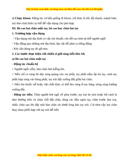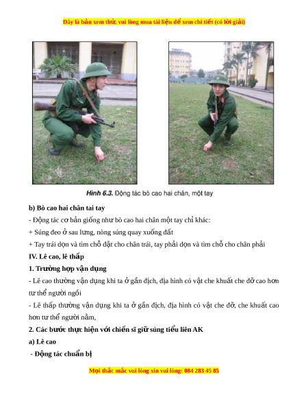 b) Bò cao hai chân tai tay - Đ ng t ộ ác cơ b n gi ả ống nh bò cao hai ư chân m t ộ tay chỉ khác: + Súng đeo s ở au l ng, nòng s ư úng quay xu ng đ ố t ấ + Tay trái d n và ọ tìm ch đ ỗ t ặ cho chân trái, tay ph i ả d n và ọ tìm ch cho chân ỗ ph i ả IV. Lê cao, lê th p ấ 1. Trư ng h ờ p v ợ ận d ng ụ - Lê cao thư ng ờ v n ậ d ng ụ khi ta g ở n ầ đ ch, ị đ a ị hình có v t ậ che khu t ấ che đ ỡ cao h n ơ t t ư h ng ể ư i ờ ngồi - Lê th p ấ thư ng ờ v n ậ d ng ụ khi ta ở g n ầ đ ch, ị đ a ị hình có v t ậ che đ , ỡ che khu t ấ cao h n ơ t t ư h ng ể ư i ờ n m ằ , 2. Các bư c ớ th c hi ự n v ệ i ớ chi n s ế ĩ gi s ữ úng ti u l ể iên AK a) Lê cao - Đ ng t ộ ác chu n b ẩ ị M i ọ thắc m c