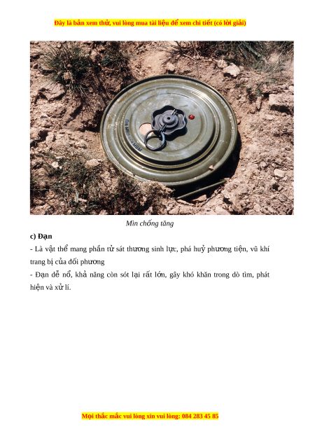 Đây là bản xem th , vu ử i lòng mua tài li u ệ đ xe ể m chi ti t (c ế ó l i ờ gi i ả ) Mìn chống tăng c) Đạn - Là v t ậ thể mang ph n ầ tử sát thư ng ơ sinh l c, ự phá huỷ phư ng ơ ti n, ệ vũ khí trang b c ị a đ ủ ối phư ng ơ - Đ n ạ dễ n , ổ khả năng còn sót l i ạ r t ấ l n,