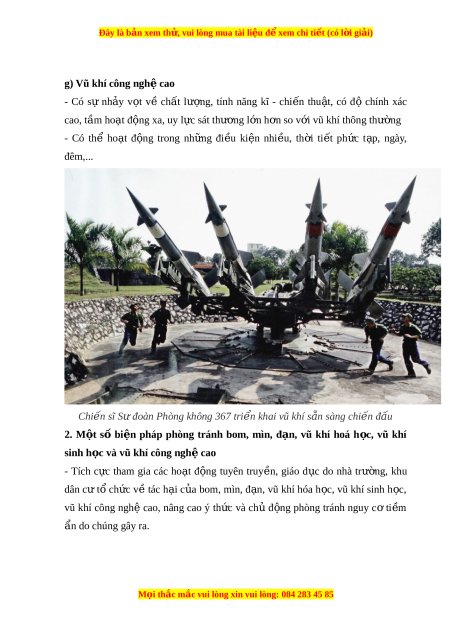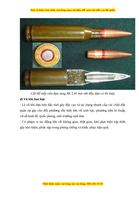 Đây là bản xem th , vu ử i lòng mua tài li u ệ đ xe ể m chi ti t ế (có l i ờ gi i ả ) C t ắ bổ m t ộ viên đ n s ạ úng AK 5.45 mm v i ớ đ u đ ầ n ạ có lõi thép d) Vũ khí hoá h c ọ - Là vũ khí d a ự trên đ c ặ tính gây đ c ộ cao và tác d ng ụ nhanh c a ủ các ch t ấ đ c ộ quân sự gây cho đ i ố phư ng ơ t n ổ th t ấ l n ớ về sinh l c, ự phư ng ơ ti n ệ kĩ thu t ậ , c s ơ ở kinh t , qu ế ốc phòng, môi trư ng ờ sinh thái. - Có ph m ạ vi tác đ ng ộ l n ớ về không gian, th i ờ gian, khó phát hi n ệ k p ị th i ờ , gây khó khăn, ph c t ứ p