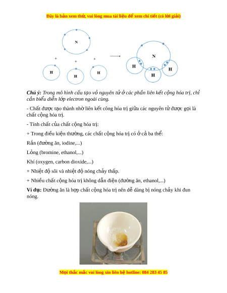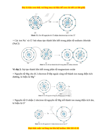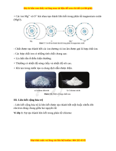 + Các ion Mg2+ và O2- hút nhau t o ạ thành liên k t ế trong phân t ử magnesium oxide (MgO). - Chất đư c ợ t o t ạ hành b i ở các ion dư ng và i ơ on âm đư c ợ g i ọ là h p ch ợ t ấ ion. - Các h p ch ợ t ấ ion có nh ng t ữ ính ch t ấ chung sau: + Là ch t ấ r n ắ đi ở u ki ề n t ệ hư ng. ờ + Thư ng ờ có nhi t ệ đ nóng ch ộ y và ả nhi t ệ độ sôi cao. + Khi tan trong nư c t ớ o ạ ra dung d ch ị d n đ ẫ ư c ợ đi n. ệ III. Liên k t ế c ng hóa t ộ rị - Liên k t ế c ng hóa t ộ r l ị à liên k t ế đư c t ợ o ạ thành b i ở m t ộ ho c ặ nhi u ề đôi electron dùng chung gi a ữ hai nguyên t . ử Ví d 1 ụ : S t ự o ạ thành liên k t ế trong phân tử chlorine M i