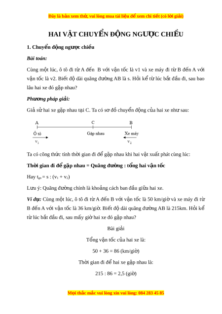 ố là v1 và xe máy đi từ B đ n ế A v i ớ v n ậ t c ố là v2. Bi t ế đ ộ dài quãng đư ng ờ AB là s. H i ỏ k ể t ừ lúc b t ắ đ u ầ đi, sau bao lâu hai xe đó g p nhau? ặ Phư ng ơ pháp gi i ả : Giả s hai ử xe g p nhau t ặ i ạ C. Ta có s đ ơ ồ chuy n đ ể ng ộ c a hai ủ xe như sau: Ta có công th c ứ tính th i ờ gian đi đ g ể p nhau ặ khi hai v t ậ xu t ấ phát cùng lúc: Th i ờ gian đi đ g ể p nha ặ u = Quãng đư ng ờ : t ng hai ổ v n t ậ c ố Hay tgn = s : (v1 + v2) L u ý: ư Quãng đư ng ờ chính là kho ng cách ả ban đ u gi ầ a hai ữ xe. Ví d : ụ Cùng m t ộ lúc, ô tô đi t ừ A đ n ế B v i ớ v n ậ t c ố là 50 km/gi ờ và xe máy đi từ B đ n ế A v i ớ v n ậ t c ố là 36 km/gi . ờ Bi t ế đ ộ dài quãng đư ng ờ AB là 215km. H i ỏ kể t l ừ úc b t ắ đ u đi ầ , sau m y gi ấ hai ờ xe đó g p ặ nhau? Bài gi i ả Tổng v n t ậ ốc c a ủ hai xe là: 50 + 36 = 86 (km/gi ) ờ Th i ờ gian đi đ hai ể xe g p ặ nhau là: 215 : 86 = 2,5 (gi ) ờ M i ọ thắc m c