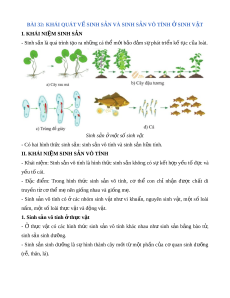 BÀI 32: KHÁI QUÁT V SI Ề NH S N Ả VÀ SINH S N Ả VÔ TÍNH SI Ở NH V T Ậ I. KHÁI NI M Ệ SINH S N Ả - Sinh s n ả là quá trình t o ạ ra nh ng ữ cá th m ể i ớ b o ả đ m ả s phát ự tri n k ể t ế c c ụ a l ủ oài. Sinh s n ả m ở t ộ số sinh v t ậ - Có hai hình th c ứ sinh s n: ả sinh s n vô t ả ính và sinh s n ả h u t ữ ính. II. KHÁI NI M SI Ệ NH S N Ả VÔ TÍNH - Khái ni m ệ : Sinh s n ả vô tính là hình th c ứ sinh s n không có s ả k ự t ế h p y ợ u t ế đ ố c và ự y u t ế ố cái. - Đặc đi m ể : Trong hình th c ứ sinh s n