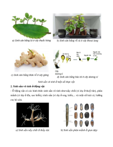 ả vô tính khác nhau như sinh s n ả b ng ằ bào t , ử sinh s n ả sinh dư ng. ỡ - Sinh s n ả sinh dư ng ỡ là s ự hình thành cây m i ớ t ừ m t ộ ph n ầ c a ủ c ơ quan sinh dư ng ỡ (r , t ễ hân, lá). Sinh s n vô t ả ính m ở t ộ số th c v ự t ậ 2. Sinh s n vô t ả ính đ ở ng v ộ t ậ - Ở đ ng ộ v t ậ có các hình th c ứ sinh s n ả vô tính nh ư n y ả ch i ồ (ví d ụ ở thu ỷ t c) ứ , phân m nh