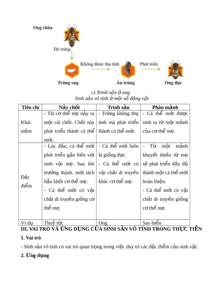 ể thành cá thể thành cá th m ể i ớ . c a c ủ ơ th m ể . ẹ m i ớ . - Lúc đ u, ầ cá thể m i ớ - Cá thể m i ớ luôn - Từ m t ộ m nh ả phát tri n ể g n ắ li n ề v i ớ là giống đ c. ự khuy t ế thi u ế từ mẹ sinh v t ậ m . ẹ Sau khi - Cá thể m i ớ có sẽ phát tri n ể đ y ầ đủ trư ng ở thành, m i ớ tách v t ậ ch t ấ di truy n ề thành m t ộ cá thể m i ớ Đặc h n kh ẳ i ỏ cơ th m ể . ẹ khác c t ơ h m ể . ẹ hoàn thiện. đi m ể - Cá thể m i ớ có v t ậ - Cá thể m i ớ có v t ậ chất di truy n ề gi ng ố cơ chất di truy n ề gi ng ố th m ể . ẹ c t ơ h m ể . ẹ Ví dụ Thu t ỷ c ứ Ong Sao bi n ể III. VAI TRÒ VÀ N Ứ G D N Ụ G C A Ủ SINH S N