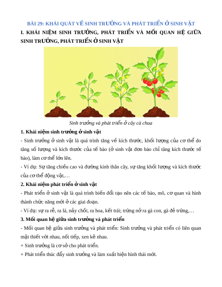 BÀI 29: KHÁI QUÁT V SI Ề NH TRƯ N Ở G VÀ PHÁT TRI N Ể SI Ở NH V T Ậ I. KHÁI NI M Ệ SINH TRƯ N Ở G, PHÁT TRI N Ể VÀ M I Ố QUAN HỆ GI A Ữ SINH TRƯ N Ở G, PHÁT TRI N Ể SI Ở NH V T Ậ Sinh trư ng và phát ở tri n ể cây cà chua ở 1. Khái ni m ệ sinh trư ng ở s ở inh v t ậ - Sinh trư ng ở ở sinh v t