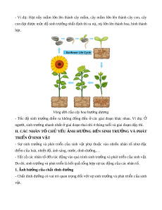 ạ nên các tế bào, mô, cơ quan và hình thành ch c ứ năng m i ớ các ở giai đo n. ạ - Ví d : ụ s r ự a r , r ễ a lá, n y ả ch i ồ , ra hoa, k t ế trái; tr ng n ứ r ở a gà con, gà đ t ẻ r ng,… ứ 3. M i ố quan h gi ệ a s ữ inh trư ng ở và phát tri n ể - Mối quan hệ gi a ữ sinh trư ng ở và phát tri n: ể Sinh trư ng ở và phát tri n ể có liên quan m t ậ thi t ế v i ớ nhau, n i ố ti p, xen ế k nhau. ẽ + Sinh trư ng ở là c s ơ cho phát ở tri n. ể + Phát tri n t ể húc đ y s ẩ inh trư ng ở và làm xu t ấ hi n hì ệ nh thái m i ớ . - Ví d : ụ H t ạ n y ả m m ầ l n ớ lên thành cây m m ầ , cây m m ầ l n ớ lên thành cây con, cây con đ t ạ đư c m ợ c ứ đ s ộ inh trư ng nh ở t ấ đ nh t ị hì ra n , n ụ ụ l n l