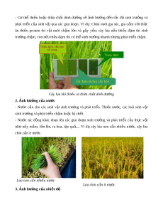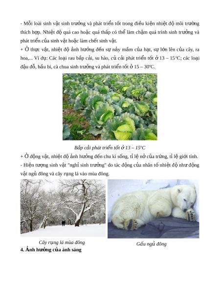 ộ khác nhau lên các giai đo n ạ sinh trư ng ở và phát tri n ể c a ủ th c ự v t ậ như n y ả m m ầ , l n ớ lên, ra hoa, t o ạ qu ,... ả Ví dụ cây lúa non c n ầ nhi u ề nư c, ớ cây lúa chín cần ít nư c. ớ Lúa non cần nhi u ề nư c ớ Lúa chín c n í ầ t nư c ớ 3. Ảnh hư ng c ở a nhi ủ t ệ độ - M i ỗ loài sinh v t ậ sinh trư ng ở và phát tri n ể t t ố trong đi u ề ki n ệ nhi t ệ đ ộ môi trư ng ờ thích h p. ợ Nhi t ệ độ quá cao ho c ặ quá th p ấ có th ể làm ch m ậ quá trình sinh trư ng ở và phát tri n c ể a s ủ inh v t ậ ho c ặ làm ch t ế sinh v t ậ . + Ở th c ự v t ậ , nhi t ệ độ nh ả hư ng ở đ n ế sự n y ả m m ầ c a ủ h t ạ , sự l n ớ lên c a ủ cây, ra hoa,... Ví d : ụ Các lo i ạ rau b p ắ c i ả , su hào, c ủ c i ả phát tri n ể t t ố ở 13 – 15oC; các lo i ạ đ u ậ đỗ, b u bí ầ