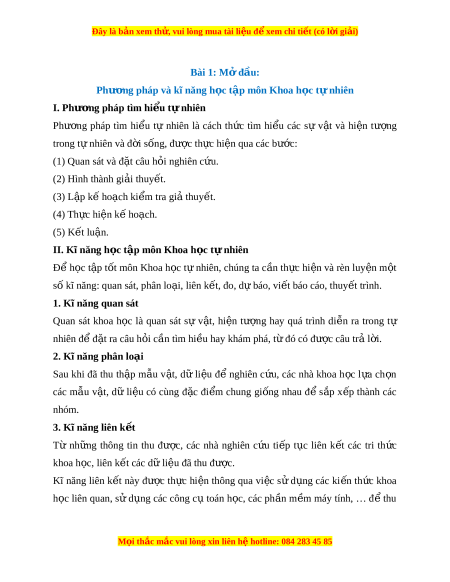 Đây là bản xem th , vu ử i lòng mua tài li u ệ đ xe ể m chi ti t (c ế ó l i ờ gi i ả ) Bài 1: Mở đầu: Phư ng pháp và k ơ ĩ năng h c t ọ p m ậ ôn Khoa h c t ọ n ự hiên I. Phư ng pháp t ơ ìm hi u t ể n ự hiên Phư ng ơ pháp tìm hi u ể tự nhiên là cách th c ứ tìm hi u ể các sự v t ậ và hi n ệ tư ng ợ trong t nhi ự ên và đ i ờ sống, được th c hi ự n qua các ệ bư c: ớ (1) Quan sát và đ t ặ câu h i ỏ nghiên c u. ứ (2) Hình thành gi i ả thuy t ế . (3) L p k ậ ế ho ch ki ạ m ể tra gi t ả huy t ế . (4) Th c ự hi n k ệ ho ế ch. ạ (5) K t ế lu n. ậ II. Kĩ năng h c t ọ p m ậ ôn Khoa h c t ọ nhi ự ên Để h c ọ t p ậ t t ố môn Khoa h c ọ t ự nhiên, chúng ta c n ầ th c ự hi n ệ và rèn luy n ệ m t ộ