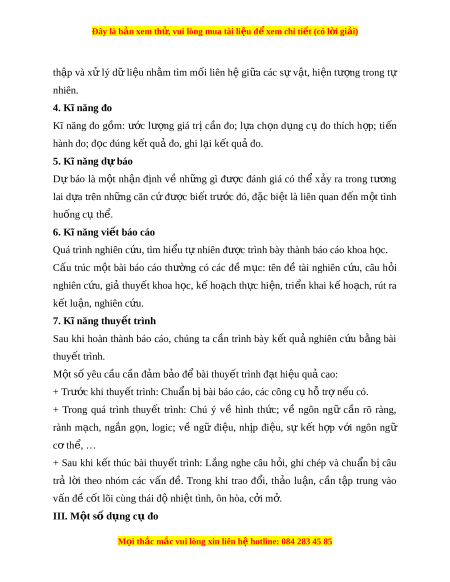 Đây là bản xem th , vu ử i lòng mua tài li u ệ đ xe ể m chi ti t (c ế ó l i ờ gi i ả ) th p ậ và xử lý d l ữ i u ệ nh m ằ tìm m i ố liên h gi ệ a ữ các s ự v t ậ , hi n ệ tư ng ợ trong tự nhiên. 4. Kĩ năng đo Kĩ năng đo g m ồ : ư c ớ lư ng ợ giá tr ịc n ầ đo; l a ự ch n ọ d ng ụ c ụ đo thích h p; ợ ti n ế hành đo; đ c ọ đúng k t ế qu đo, ghi ả l i ạ k t ế qu đo. ả 5. Kĩ năng d báo ự Dự báo là m t ộ nh n ậ đ nh ị về nh ng ữ gì đư c ợ đánh giá có th ể x y ả ra trong tư ng ơ lai d a ự trên nh ng ữ căn c ứ đư c ợ bi t ế trư c ớ đó, đ c ặ bi t ệ là liên quan đ n ế m t ộ tình huống c t ụ h . ể 6. Kĩ năng vi t ế báo cáo Quá trình nghiên c u, t ứ ìm hi u t ể nhi ự ên đư c