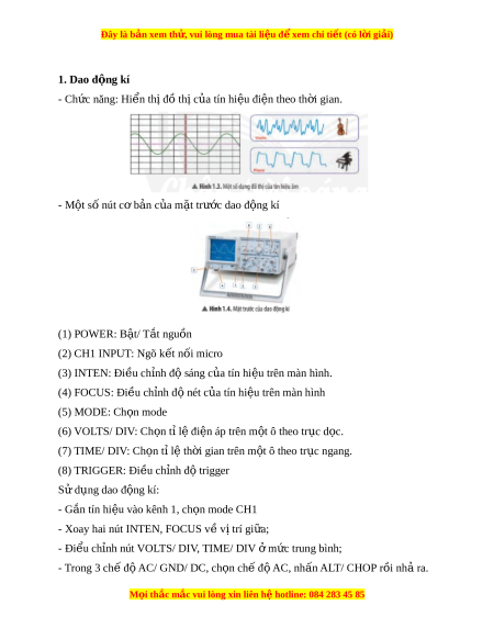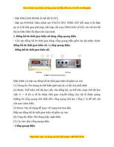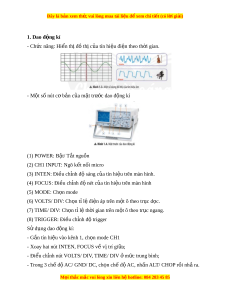 Đây là bản xem th , vu ử i lòng mua tài li u ệ đ xe ể m chi ti t (c ế ó l i ờ gi i ả ) 1. Dao đ ng kí ộ - Ch c ứ năng: Hi n t ể h đ ị t ồ h c ị a t ủ ín hi u đi ệ n t ệ heo th i ờ gian. - M t ộ số nút c b ơ n ả c a m ủ t ặ trư c dao ớ đ ng kí ộ (1) POWER: B t ậ / T t ắ ngu n ồ (2) CH1 INPUT: Ngõ k t ế n i ố micro (3) INTEN: Đi u ch ề nh đ ỉ s ộ áng c a ủ tín hi u t ệ rên màn hình. (4) FOCUS: Đi u ch ề nh đ ỉ nét ộ c a ủ tín hi u t ệ rên màn hình (5) MODE: Ch n m ọ ode (6) VOLTS/ DIV: Ch n t ọ l ỉ đi ệ n áp t ệ rên m t ộ ô theo tr c d ụ c. ọ (7) TIME/ DIV: Ch n ọ t l ỉ t ệ h i ờ gian trên m t ộ ô theo tr c ngang. ụ (8) TRIGGER: Đi u ề ch nh đ ỉ t ộ rigger S d ử ng dao ụ đ ng kí ộ : - G n t ắ ín hi u vào kênh 1, ch ệ n ọ mode CH1