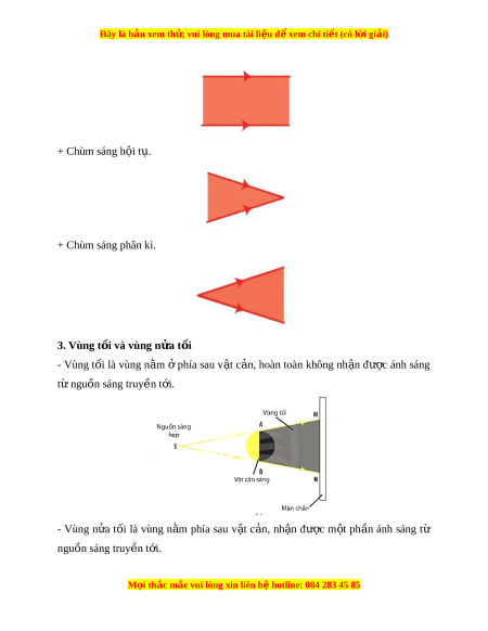 Đây là bản xem th , vu ử i lòng mua tài li u ệ đ xe ể m chi ti t (c ế ó l i ờ gi i ả ) + Chùm sáng h i ộ t . ụ + Chùm sáng phân kì. 3. Vùng t i ố và vùng n a t ử i ố - Vùng t i ố là vùng n m ằ ở phía sau v t ậ c n, ả hoàn toàn không nh n ậ đư c ợ ánh sáng t ngu ừ ồn sáng truy n t ề i ớ . - Vùng n a ử t i ố là vùng n m ằ phía sau v t ậ c n, ả nh n ậ đư c ợ m t ộ ph n ầ ánh sáng từ nguồn sáng truy n t ề i ớ . M i