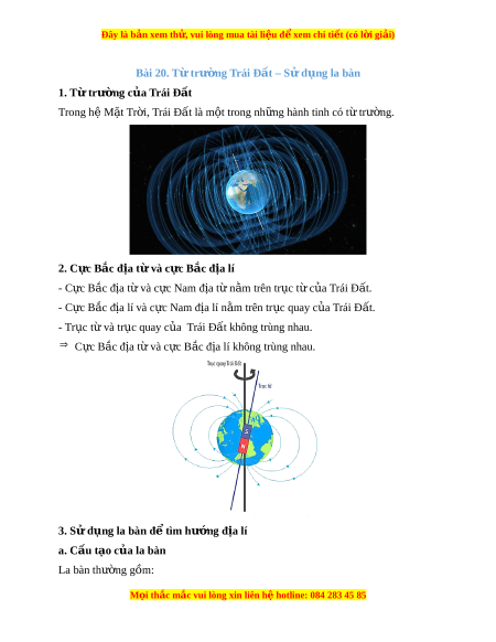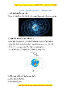 Đây là bản xem th , vu ử i lòng mua tài li u ệ đ xe ể m chi ti t (c ế ó l i ờ gi i ả ) Bài 20. Từ trư ng ờ Trái Đ t ấ – S d ử ng l ụ a bàn 1. Từ trư ng ờ c a ủ Trái Đ t ấ Trong hệ M t ặ Tr i ờ , Trái Đất là m t ộ trong nh ng hành ữ tinh có t t ừ rư ng. ờ 2. Cực Bắc đ a t ị và c ừ c B ự ắc đ a l ị í - C c ự B c ắ đ a ị t và c ừ c N ự am đ a t ị n ừ m ằ trên tr c t ụ c ừ a ủ Trái Đ t ấ . - C c ự B c ắ đ a ị lí và c c N ự am đ a l ị í n m ằ trên tr c quay c ụ a ủ Trái Đ t ấ . - Tr c t ụ và t ừ r c quay c ụ a