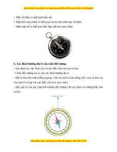 ộ kim nam châm có th quay t ể ự do trên m t ộ tr c c ụ đ ố nh. ị + M t ộ m t ặ s có ố thể quay đ c l ộ p ậ v i ớ kim nam châm. b. Xác đ nh h ị ư ng đ ớ a l ị í c a m ủ t ộ đ i ố tư ng ợ - Xác định các c c N ự am (S) và c c ự B c ắ (N) c a ủ kim la bàn. - Ch n ọ đối tư ng m ợ à ta c n xác đ ầ nh h ị ư ng đ ớ a l ị í. - Đ t ặ la bàn trên m t ặ ph ng ẳ ngang. Ch cho ờ kim la bàn đ ng yên, ứ xoay la bàn sao cho vạch 0 trùng v i ớ c c B ự c c ắ a ủ kim nam châm. - Đ c ọ giá trị c a ủ góc h p ợ b i ở hư ng ớ đ i ố tư ng ợ c n ầ xác đ nh ị và hư ng ớ B c ắ trên la bàn. M i
