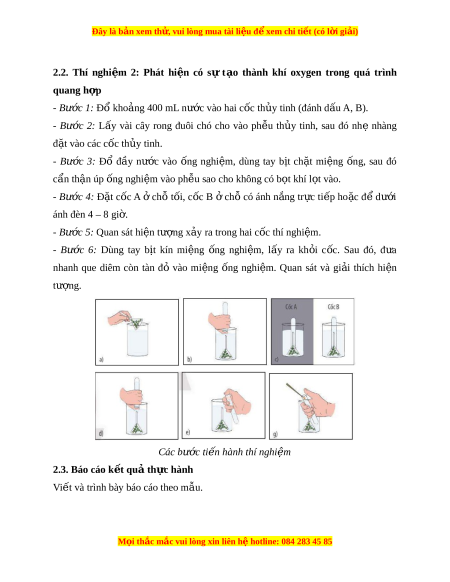 ủ tinh, sau đó nhẹ nhàng đ t ặ vào các cốc th y t ủ inh. - Bư c ớ 3: Đổ đ y ầ nư c ớ vào ng ố nghi m ệ , dùng tay b t ị ch t ặ mi ng ệ ng, ố sau đó cẩn th n ậ úp ng nghi ố m ệ vào ph u s ễ ao cho không có b t ọ khí l t ọ vào. - Bư c ớ 4: Đ t ặ c c ố A ở chỗ t i ố , c c ố B ở ch ỗ có ánh n ng ắ tr c ự ti p ế ho c ặ đ ể dư i ớ ánh đèn 4 – 8 gi . ờ - Bư c ớ 5: Quan sát hi n t ệ ư ng x ợ y ả ra trong hai c c t ố hí nghi m ệ . - Bư c ớ 6: Dùng tay b t ị kín mi ng ệ ng ố nghi m ệ , l y ấ ra kh i ỏ c c. ố Sau đó, đ a ư
