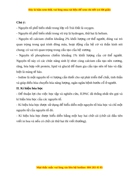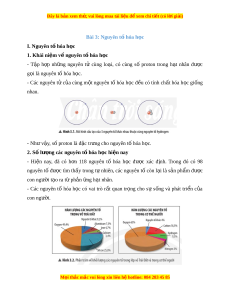 ạ , có cùng số proton trong h t ạ nhân đư c ợ g i ọ là nguyên tố hóa h c. ọ - Các nguyên t ử c a ủ cùng m t ộ nguyên t hóa ố h c ọ đ u ề có tính ch t ấ hóa h c ọ gi ng ố nhau. - Nh v ư y ậ , số proton là đ c ặ tr ng ư cho nguyên t hóa ố h c. ọ 2. Số lư ng các ợ nguyên t hóa h ố c ọ hi n nay ệ - Hi n ệ nay, đã có h n ơ 118 nguyên tố hóa h c ọ đư c ợ xác đ nh. ị Trong đó có 98 nguyên tố đư c ợ tìm th y ấ trong t ự nhiên, các nguyên t ố còn l i ạ là s n ả ph m ẩ đư c ợ con ngư i ờ t o r ạ a t ph ừ n ả ng h ứ t ạ nhân. - Các nguyên tố hóa h c ọ có vai trò r t ấ quan tr ng ọ cho s ự s ng ố và phát tri n ể c a ủ con ngư i ờ . M i