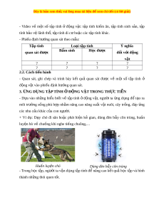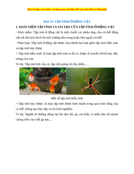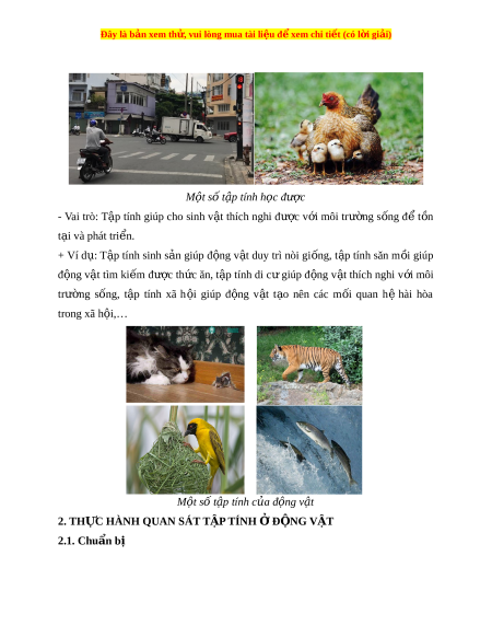 Đây là bản xem th , vu ử i lòng mua tài li u ệ đ xe ể m chi ti t (c ế ó l i ờ gi i ả ) M t ô sô t p t ậ ính h c đ ọ ư c ợ - Vai trò: T p ậ tính giúp cho sinh v t ậ thích nghi đư c ợ v i ớ môi trư ng ơ s ng ố đ ể t n ô t i a va phat tri n. ể + Ví d : ụ T p ậ tính sinh s n ả giúp đ ng ộ v t ậ duy trì nòi gi ng, ố t p ậ tính săn m i ô giúp đ ng ộ v t ậ tìm ki m ê đư c ợ th c ứ ăn, t p ậ tính di c ư giúp đ ng ộ v t ậ thích nghi v i ớ môi trư ng ơ s ng, ố t p ậ tính xã h i ộ giúp đ ng ộ v t ậ t o a nên cac m i ố quan h ê hai hòa trong xã h i ộ ,… M t ô sô t p ậ tính c a ủ đ ng v ô t ậ 2. TH C Ự HÀNH QUAN SÁT T P Ậ TÍNH Đ Ở N Ộ G V T Ậ 2.1. Chuẩn bị