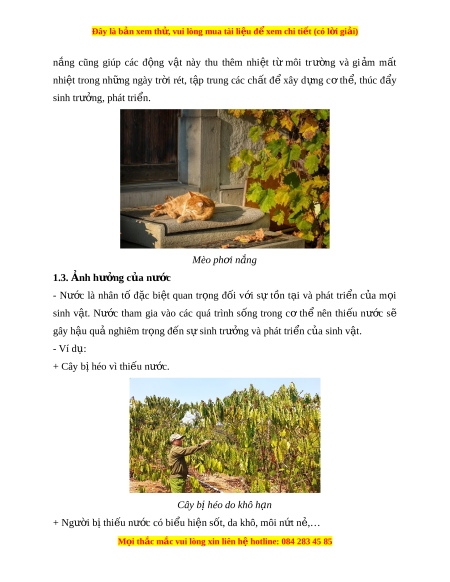 Đây là bản xem th , vu ử i lòng mua tài li u ệ đ xe ể m chi ti t (c ế ó l i ờ gi i ả ) n ng ắ cung giúp cac đ ng ô v t â nay thu thêm nhi t ê t ư môi trư ng ơ va gi m a m t â nhiêt trong nh ng ư ngay tr i ơ ret, t p â trung cac ch t â đ ê xây d ng ư c ơ th , ê thúc đ y â sinh trư ng, ơ phat tri n. ê Meo ph i ơ n ng ă 1.3. Ảnh hư ng c ở a n ủ ư c ớ - Nư c ơ la nhân tô đ c ặ bi t ê quan tr ng ọ đ i ô v i ơ sư t n ồ t i ạ va phat tri n ê c a u m i ọ sinh v t â . Nư c